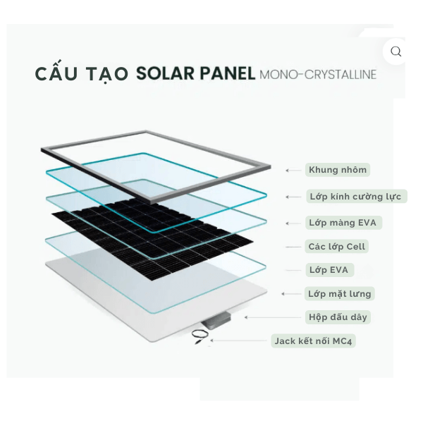 Thông thường, tấm pin năng lượng mặt trời có cấu tạo gồm các bộ phận chính như sau: khung nhôm, lớp tế bào quang điện, màng EVA, tấm nền pin, hộp đấu dây,cáp DC, jack kết nối MC4.