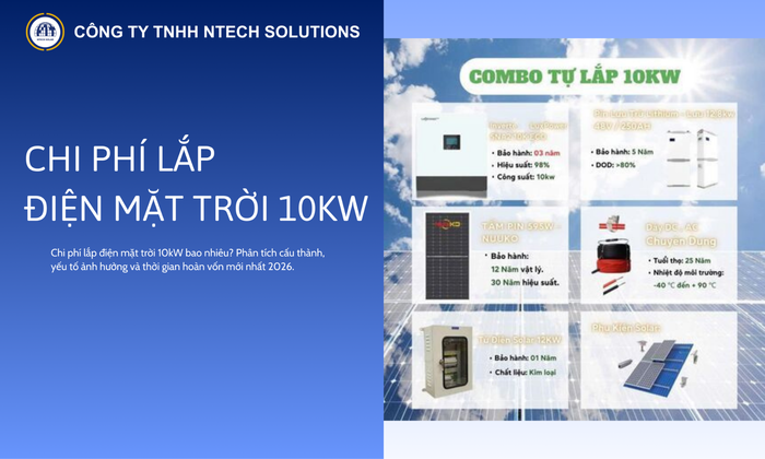 Chi phí lắp điện mặt trời 10kW bao nhiêu? Phân tích cấu thành, yếu tố ảnh hưởng và thời gian hoàn vốn mới nhất 2026.