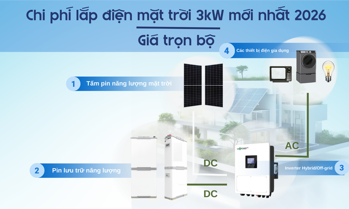 Chi phí lắp điện mặt trời 3kW bao nhiêu? Xem bảng giá combo 3kW không lưu trữ, có lưu trữ và độc lập mới nhất 2026.