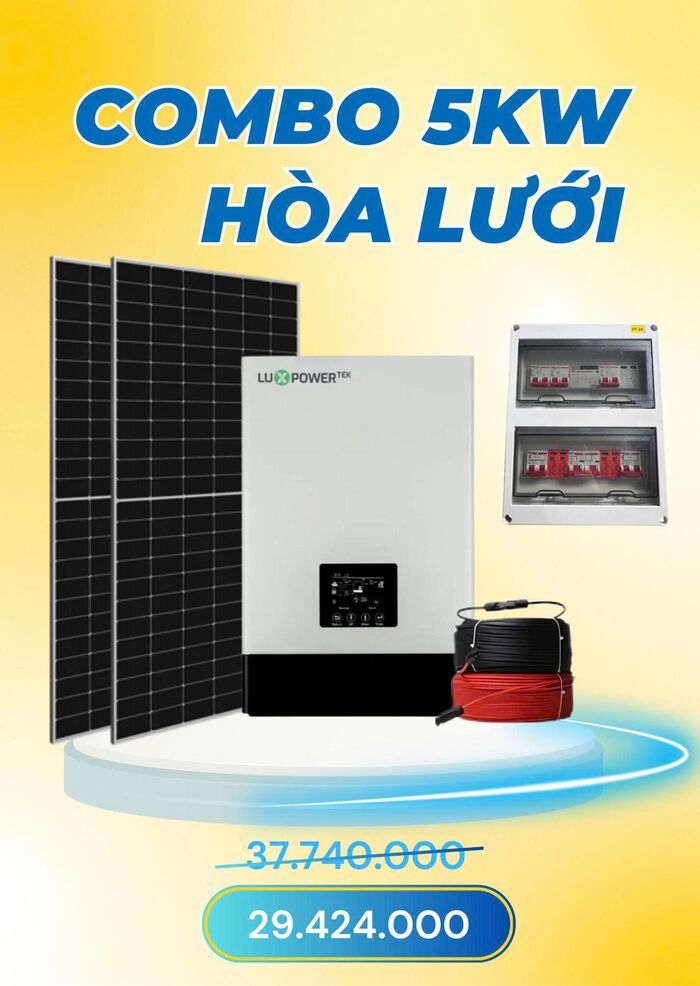 Combo điện năng lượng mặt trời 5kW hòa lưới gồm inverter, tấm pin và phụ kiện. Cập nhật giá và cấu hình mới nhất.
