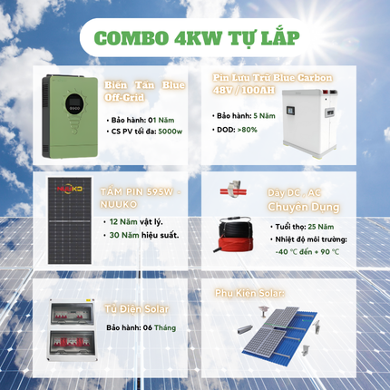Hệ thống điện mặt trời Hybrid 4kw mà NTech Solutions cung cấp bao gồm: 10 Tấm pin năng lượng mặt trời 595w - 2 mặt kính, 1 Inverter OFF-GRID 4KW BCT-FX-4KW - Hãng Blue Carbon 1 PHA , 1 ắc quy Lithium 2.56KWH 24V100Ah, 1 tủ điện 4kw và phụ kiện solar kèm theo. Chi tiết hơn về combo điện năng lượng mặt trời này xem trong bảng báo giá dưới đây: