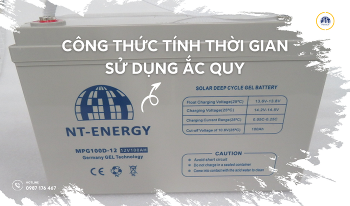Thời gian sử dụng (giờ) = (Dung lượng ắc quy (Ah) * Điện áp ắc quy (V) * Hệ số sử dụng (η)) / Công suất tiêu thụ (W)