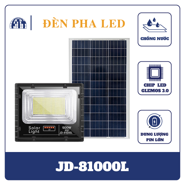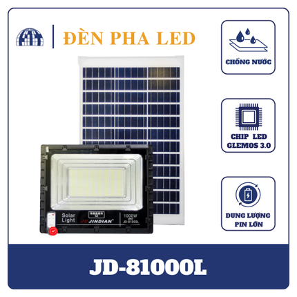 Đèn pha năng lượng mặt trời JD-81000L đạt tiêu chuẩn chống nước IP67. Cho khả năng chống thấm cực cao.