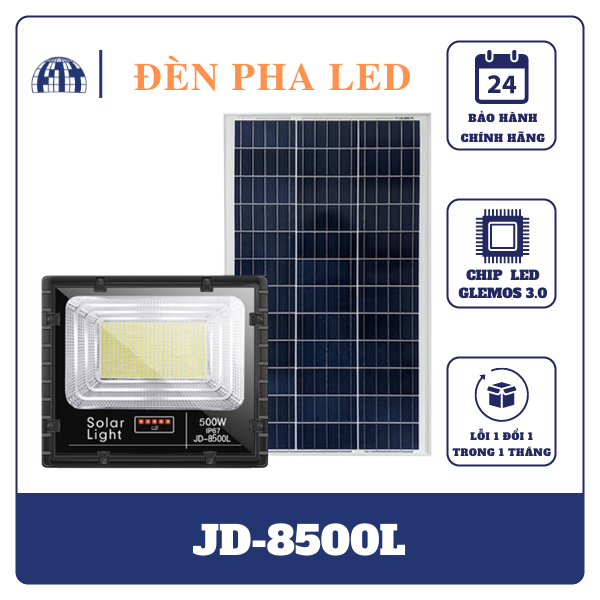 Đèn năng lượng mặt trời 500W JD-8500L là model đèn pha năng lượng mặt trời cao cấp của hãng Jindian. Công suất chiếu sáng lên đến 500w với số chíp led 806 hạt có thể phủ sáng một vùng diện tích 600m2. Đặc biệt được hãng trang bị chip led SMD 5730 siêu sáng, phù hợp để chiếu sáng khu vực sân vườn bên ngoài trời. Với viên pin lithium dung lượng 60000mah có thể sử dụng thắp sáng đến 12h-14h. Chi tiết hơn về sản phẩm xem tại phía dưới nhé.