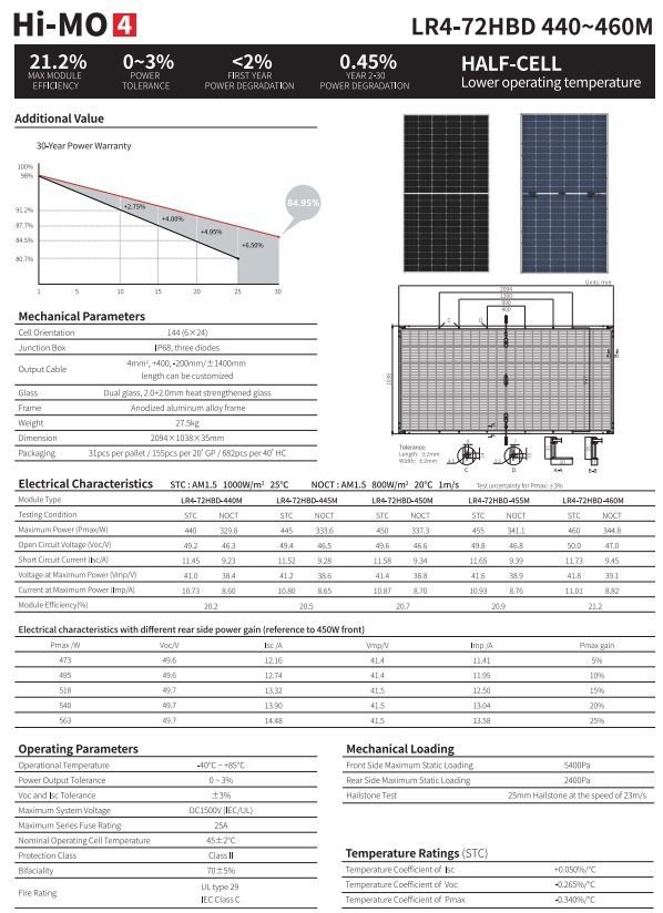 I. Datasheet chi tiết về tấm pin năng lượng mặt trời Longi 450w 2 mặt kính LR4-72HBD 450M