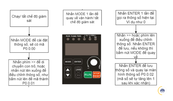 Lưu ý: Có rất nhiều thông số không thể được cài đặt khi biến tần bơm đang hoạt động do đó yêu cầu người vận hành phải tắt động cơ cũng như biến tần.