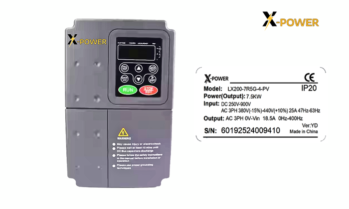 Tem thông số (Nameplate) là nơi thể hiện toàn bộ đặc tính kỹ thuật quan trọng của biến tần. Việc đọc đúng giúp chọn đúng mô hình, đấu nối đúng và cài đặt chuẩn. Dưới đây là cách hiểu từng mục trên tem XPower. Ví dụ với model LX200-7R5G-4-PV.