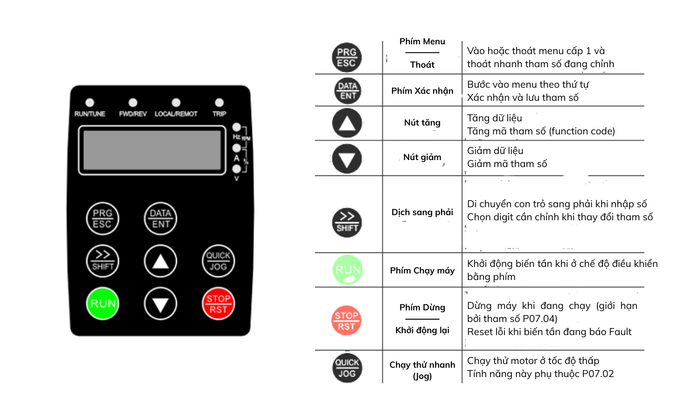 Nhận diện các phím chức năng trên màn hình điều khiển biến tần XPower – sử dụng khi cài đặt tham số.