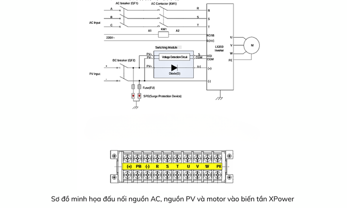 Biến tần XPower sử dụng nguồn PV cao áp (250–900VDC) và đầu ra 3 pha 380–440V, nên việc đấu dây phải tuân thủ đúng chuẩn để an toàn và đạt hiệu suất tối đa. Dưới đây là sơ lược các phần đấu nối chính của XPower: