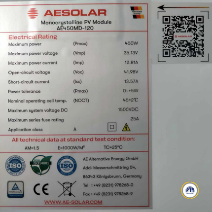 Pin AE 450W (AE MD-144 Series) là dòng sản phẩm mới nhất của AE Solar. Đây là một thương hiệu lớn của Đức, khá uy tín trong lĩnh vực năng lượng mặt trời. Với công nghệ tiên tiến, sản phẩm mang đến hiệu quả, độ bền và an toàn vượt trội, hứa hẹn trở thành giải pháp tối ưu cho nhu cầu điện năng của bạn.