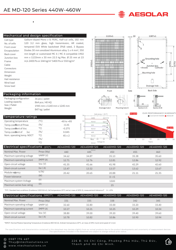 II. Thông tin kỹ thuật chi tiết của tấm pin AE Solar 450w AE MD-144 Series 440-460W