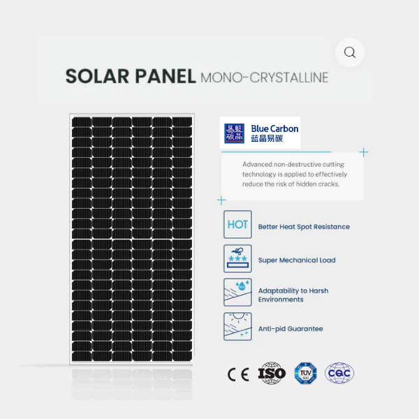 Miếng pin năng lượng mặt trời 550W của hãng Blue Carbon là một lựa chọn mới, tối ưu hơn cho người dùng tại Việt Nam. Do tấm pin mặt trời 550w mono này được sử dụng nhiều có các hệ thống điện độc lập công suất nhỏ. Giảm ảnh hưởng từ bóng râm: Bằng cách cắt tấm pin thành 2 phần độc lập, mức độ ảnh hưởng từ bóng râm giảm xuống một nửa.