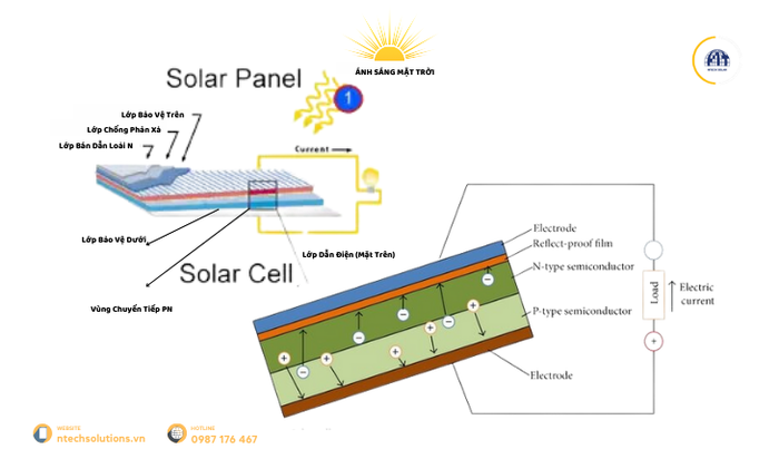 Nguyên lý hoạt động của tấm pin năng lượng mặt trời dựa trên hiệu ứng quang điện. Hiệu ứng quang điện là hiện tượng các điện tử bị giải phóng khỏi nguyên tử khi ánh sáng chiếu vào. Trong tấm pin năng lượng mặt trời, các tế bào quang điện được cấu tạo từ các lớp bán dẫn khác nhau. Khi ánh sáng chiếu vào, các điện tử ở lớp bán dẫn có năng lượng cao hơn sẽ bị giải phóng khỏi nguyên tử và di chuyển qua lớp bán dẫn có năng lượng thấp hơn, tạo ra dòng điện. Điện được tạo ra từ tấm pin năng lượng mặt trời là điện một chiều (DC).
