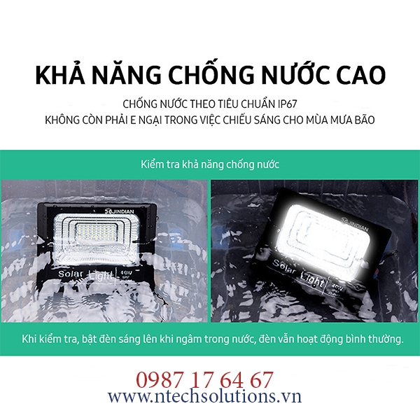 Đèn pha năng lượng mặt trời 100W JD-8800L Jindian đạt chuẩn chống nước IP67. Với chỉ số này, sản phẩm có thể chống nước hoàn toàn. Nếu rơi vào nước với độ sâu tầm 3m thì đèn vẫn hoạt động tốt. Do đó bạn có thể lắp đặt đèn led nlmt này trong nhà hay ngoài trời thoải mái nhé..