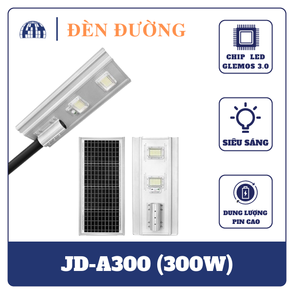 Đèn đường năng lượng mặt trời liền thể 300w JD-A300 với thiết kế nguyên khối cao cấp. Nổi bật với màu xám trang nhã, thu hút khách hàng ngay từ cái nhìn đầu tiên. Được trang bị một tấm pin mặt trời mỏng, nhỏ gọn nhưng có tỷ lệ chuyển đổi quang-điện rất cao. Bởi cấu tạo của tấm pin là bằng chất bán dẫn silicon monocrystalline tinh khiết, hấp thụ ánh nắng rất là tốt. Chi tiết hơn về sản phẩm xem ở bên dưới nhé.